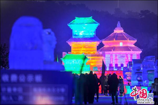 到处都是琼楼玉阁,到处都是流红叠翠,漫步在灯光冰雕的世界中,思绪在流光溢彩中飞扬。2018沈阳国际冰雪节在棋盘山盛京坛城冰雕园隆重开幕。冰雪雕展、盛京灯会、关东庙会将会持续展出到正月十五。今年冰雪雕分为盛景坛城及关东影视城两个景区,此次活动创造了许多奇迹,第一次在全世界范围内用冰雕形式展现坛城文化;第一次用精美冰雕艺术完美打造故宫大政殿及八门四塔;第一次用多元素灯光艺术完美展现坛城冰雕作品;第一次单冰雕作品近千人同时雕刻。