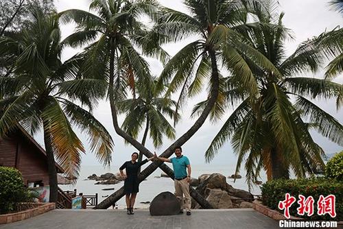 游客在海南三亚天涯海角游览区内的情侣树前合影。