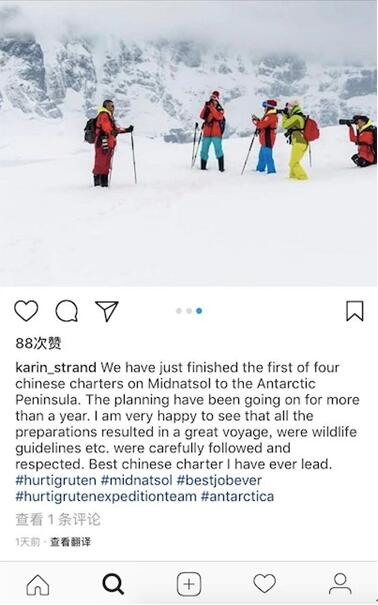Karin Strand在文中写到:“我们刚刚完成第一艘中国游客包船的‘午夜阳光号’南极半岛游。整个旅程筹备了一年多,很高兴所有的注意事项,诸如野生动物保护规范,都被遵守和尊重。这是一趟伟大的旅程,这也是我带过的最好的一批中国游客。”