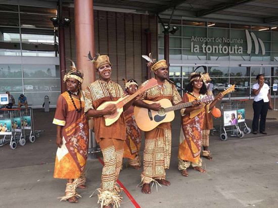 在碧海蓝天环绕下的努美阿国际机场,航班顺利抵达,新喀里多尼亚旅游局的代表们亲自前来为中国客人接风,并精心安排了卡纳克民族传统的欢迎仪式,载歌载舞的欢乐气氛让大家一扫旅途的疲惫。