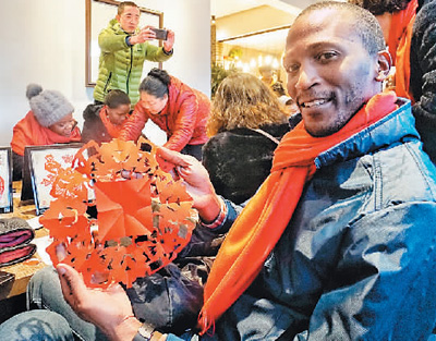 来自博兹瓦纳的留学生春节期间在北京体验剪纸。