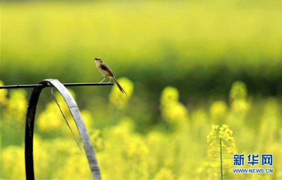 3月3日,一只小鸟在贵州省从江县的油菜花田中停留。新华社发(梁云凯摄)