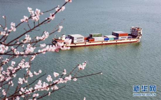 3月3日,在湖北省秭归县,长江岸边山花盛开。 新华社发(郑家裕 摄)