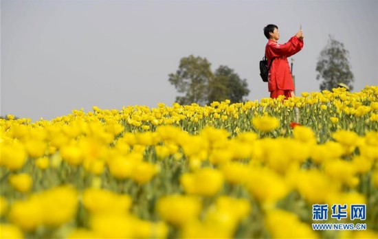 3月3日,游客在江西省新余市一植物园拍摄郁金香。 新华社发(赵春亮 摄)