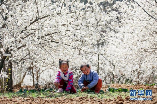 3月3日,两名小朋友在贵州省威宁县龙街镇的樱桃园内玩耍。 新华社发(何欢 摄)