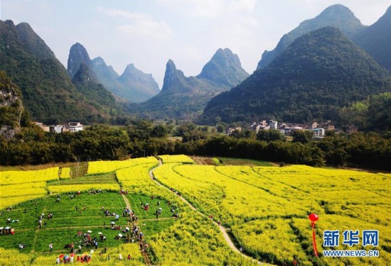 3月3日,在广西河池市宜州区,游人在欣赏盛开的油菜花。 新华社发(蒙增师 摄)