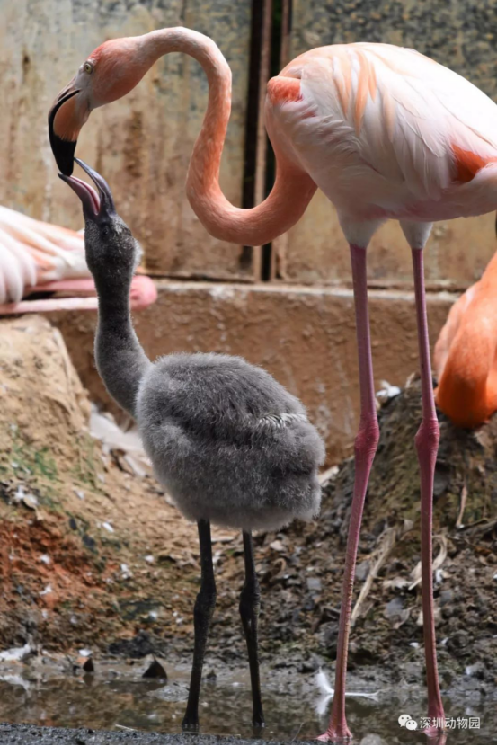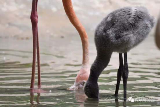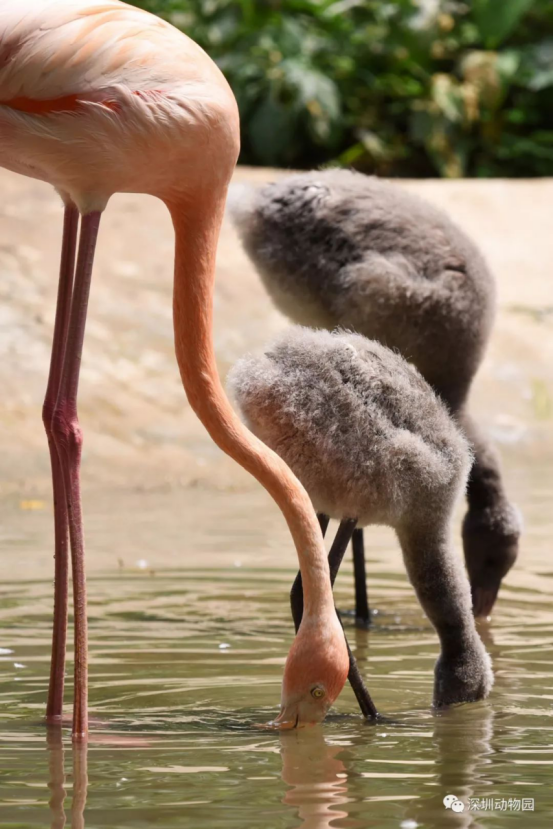 我是勤劳的火烈鸟宝宝,你看我正在努力跟爸妈学捕食本领呢。别看我现在灰扑扑的,等我长大了,就会跟爸妈一样鲜红亮丽。