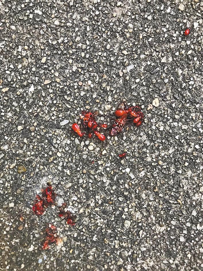 昨天,在荔香公园靠近深南大道的一处公园小径上,这种形似“红蚂蚁”的昆虫整体呈鲜红色,身上有白色斑点,身形有大有小,大的身长约2厘米,小的身长不到1厘米。居民反映,端午节后,她和朋友在小区门口多次见到这种“红蚂蚁”,非常担心这类不知名昆虫会影响到大家的生活。