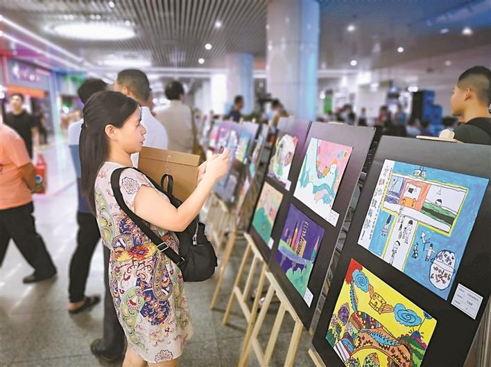 市民参观地铁文化节学生绘画作品。 受访单位供图