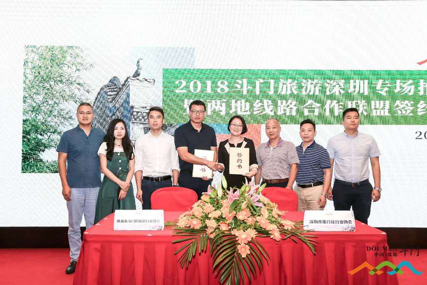 随后,深圳旅行社行业协会和珠海市斗门区旅游行业代表签订了2018两地线路合作协议。