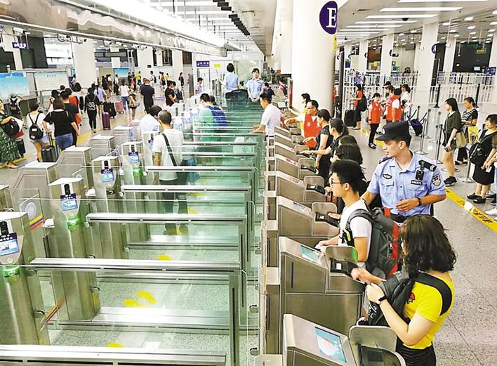 边检民警与口岸义工在福田口岸出境大厅新改扩建自助通道引导帮助旅客快捷通关。