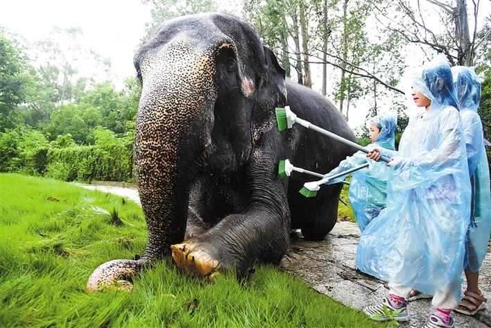 当天上午,深圳野生动物园工作人员为该园大象准备了香蕉、苹果、西瓜、火龙果等果蔬。虽然下着雨,但丝毫没有影响游客与大象互动的兴致。游客在动物园饲养员陪同下清洁象舍,并为大象刷身、洗澡,大象还获得游客喂食各种果蔬。现场充满欢乐气氛。