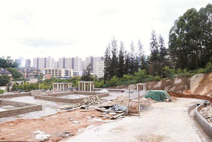 白石龙音乐公园建设情况究竟如何?8月13日,记者来到施工现场,发现整个园区仍被施工隔离板围挡着,禁止路人进入的红色标识很是醒目,从金龙路进入园区,有挖掘机、轧路机和铲车正忙着作业。从山顶往下眺看,整个园区已现雏形,多个功能区、特色廊架、特色景墙、道路路灯与公厕主体框架的施工已基本完成,部分道路正进行翻修。看起来貌似离建成不远了,但各功能区的搭建进展却并不同步。位于金龙路入口另一侧的露天剧场只初步搭建了水泥主体框架,路面未铺设石板,周围边坡也尚未完全加固,施工场面十分狼藉,进度远远落后于其他搭建项目。