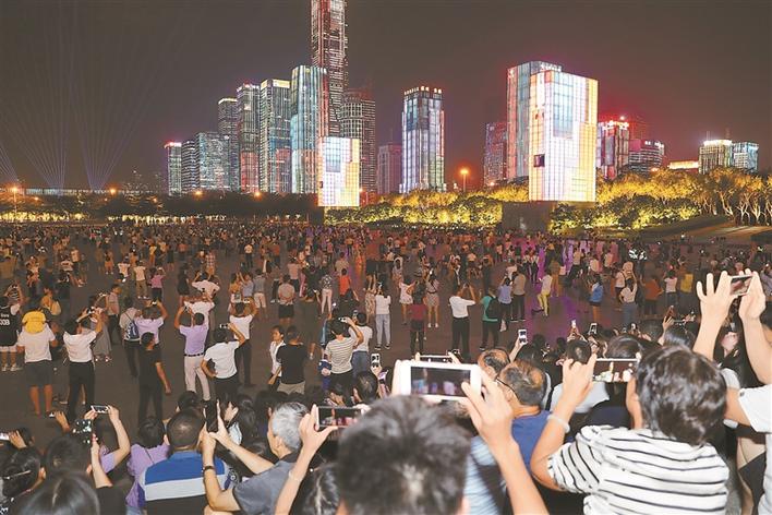 国庆假期,灯光秀引来成千上万市民和游客,但整个现场井然有序。深圳特区报记者李忠摄