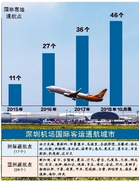 受多方面因素影响,国际业务一直是深圳机场主业发展的短板,洲际远程航线更是长期空白。国际航线的发展不仅滞后于城市经济社会发展的需要,也给深圳及周边城市市民商旅出行造成极大不便。2016年,随着国家“十三五”规划将深圳机场定位升级为“国际航空枢纽”,这一局面开始转变。在中国民航局、深圳市政府的大力支持下,依托深圳及周边城市旺盛的航空出行市场,深圳机场国际业务发展驶入快车道。在目前通航的46个国际客运城市中,有35个是2016年以来新增的。
