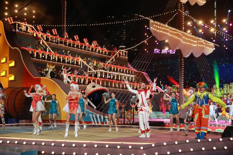 此次节目借助园区内特有的水上表演区域,搭建起了一艘带有奇幻色彩的邮轮,作为主舞台。融合了魔幻的舞美形象、多彩的灯光效果以及科技感十足的大型水上舞台,节目全方位玩转声光电,舞台呈现壮阔的山河风光,气派的都市景象。成为了此次节目的一大亮点。