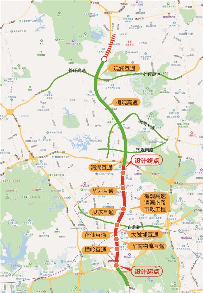 市交通运输局建设中心提供的资料显示,梅观高速清湖南段市政道路工程,南起原梅林主线收费站南端,北至石清大道与清湖立交之间,道路全长约7.975千米,包含规划民乐路至石清大道的10个节点范围。梅观路改造将采用城市快速路标准,设置双向8车道主路,设计速度80千米/小时,双向6车道辅路,设计速度40千米/小时,标准断面总宽为90米。