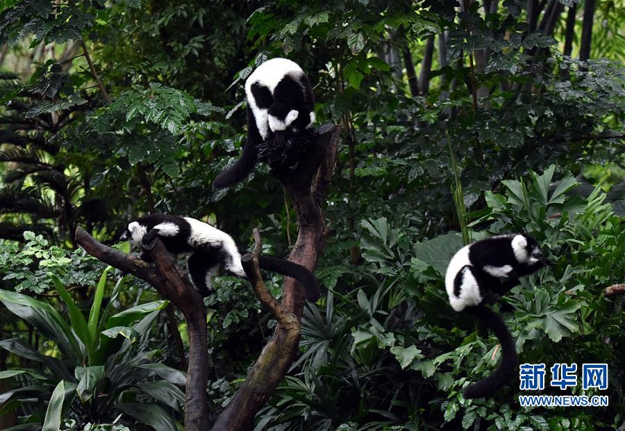 3月6日,在广州长隆野生动物世界,斑狐猴三胞胎在树枝上跳跃。 当日,广州长隆野生动物世界成功繁育的我国首例斑狐猴三胞胎正式与游客见面。出生以来,经过10个月的专业呵护,这三只雄性斑狐猴平均体重由出生时的100克增长到2400克左右。 新华社记者刘大伟摄