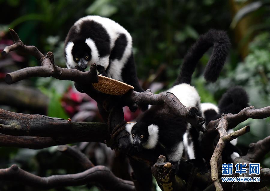 3月6日,在广州长隆野生动物世界,斑狐猴三胞胎在树枝上进食。 当日,广州长隆野生动物世界成功繁育的我国首例斑狐猴三胞胎正式与游客见面。出生以来,经过10个月的专业呵护,这三只雄性斑狐猴平均体重由出生时的100克增长到2400克左右。 新华社记者刘大伟摄