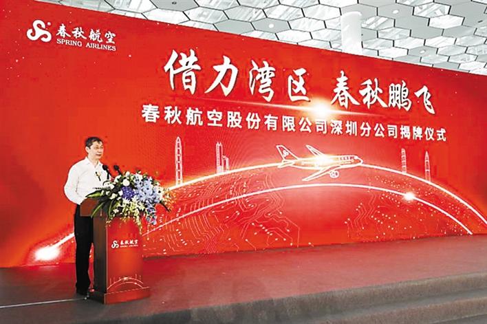 深圳商报2019年7月19日讯 7月18日,春秋航空深圳分公司成立揭牌仪式在深圳机场举行。这是春秋航空在粤港澳大湾区设立的首家分公司。未来,春秋航空将以深圳分公司成立为契机,紧紧抓住粤港澳大湾区历史发展机遇,进一步完善航线网络结构,为深圳国际航空枢纽建设贡献力量。深圳市委常委、常务副市长刘庆生出席揭牌仪式。